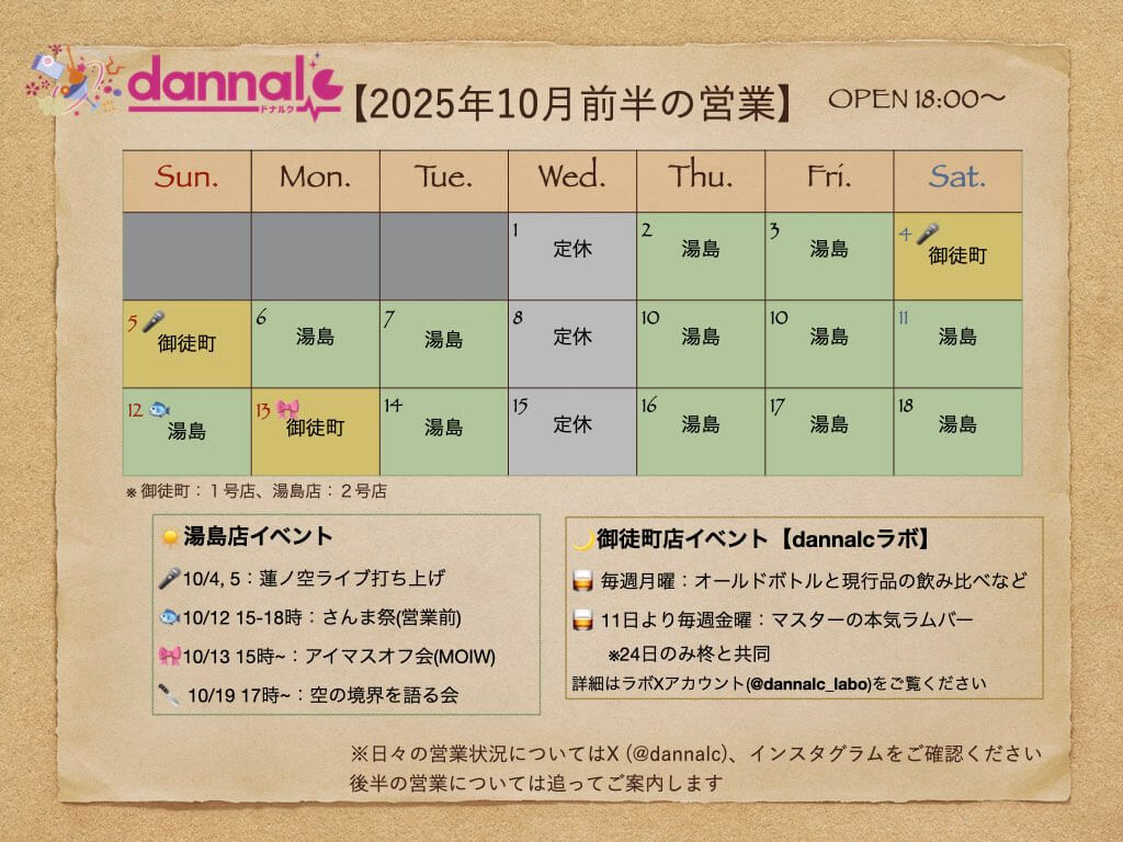 10/3・4・13は湯島店(新店舗)が貸切営業のため、上野御徒町店(1号店)で通常営業を行います。